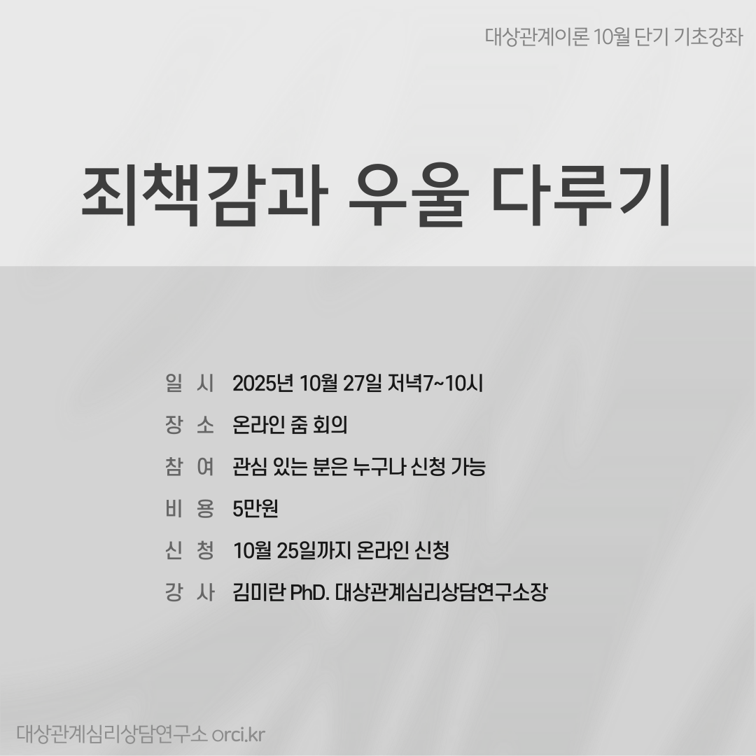 # 월별 기초 단기강좌 주제 : 1월. 마음을 움직이는 내적 대상관계의 토대 2월. 좌절을 성장 동력으로 다루기 3월. 자기(self)의 성장을 가능하게 하는 것 4월. 자폐적 상태가 공생 관계로 발달하는 과정 5월. 심리적 독립을 향한 과정 6월. 내적 심리구조 파악하기 7월. (대상)관계패턴의 이해 8월. 삶의 문제가 반복되는 방식들 9월. 조절할 수 있는 분노와 조절할 수 없는 분노 10월. 죄책감과 우울 다루기 11월. 상실과 애도 12월. 진정한 나를 찾기