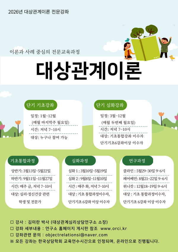 [정규강좌] 대상관계이론 기초 통합과정 상반기 일정 : 2026년 3월 13일 - 5월 22일, 매주 금요일 저녁 7시~10시 (1회 3시간, 총 30시간) * 5월8일은 휴강입니다 하반기 일정 : 2026년 9월 11일 - 11월 27일, 매주 금요일 저녁 7시~10시 (1회 3시간, 총 30시간) * 9/25, 10/9일은 휴강입니다 |