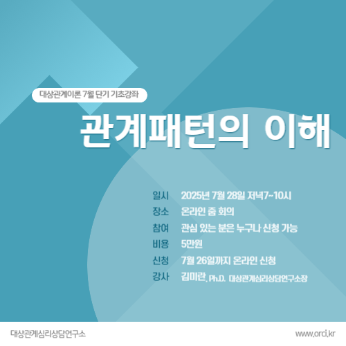 대상관계이론 7월 단기 기초강좌는 [관계패턴의 이해]를 주제로 진행됩니다.