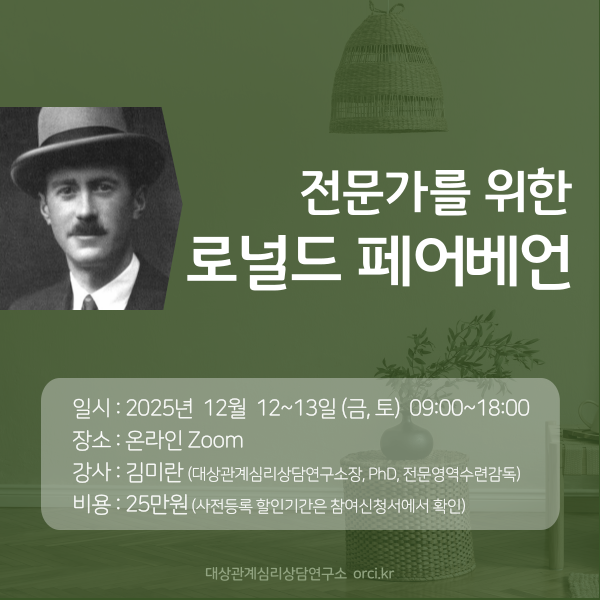 전문가를 위한 로널드 페어베언 강좌는 페어베언의 이론을 이해하고, 상담 실제에 적용하는 법을 배우기 위한 과정입니다.