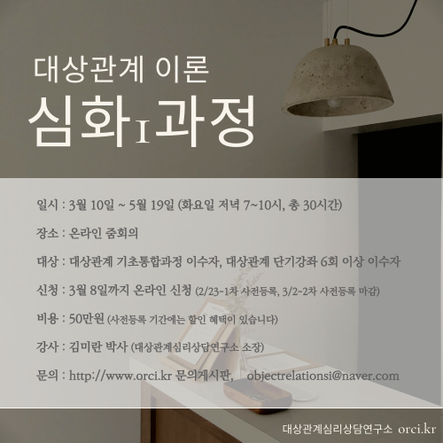 # 심화 1 과정은 본 연구소의' 대상관계 기초통합과정' 이수하신 분, '대상관계 단기강좌'를 6회 이상 이수하신 분, 또는 이에 준하는 대상관계교육을 받으신 분에 한하여 수강 가능합니다.