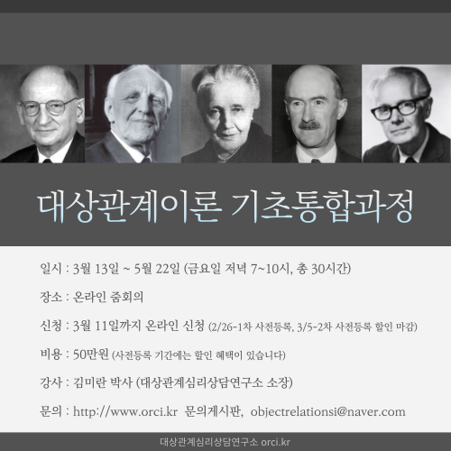 대상관계이론 기초 통합과정 개강안내 (온라인, 3/13~5/22)